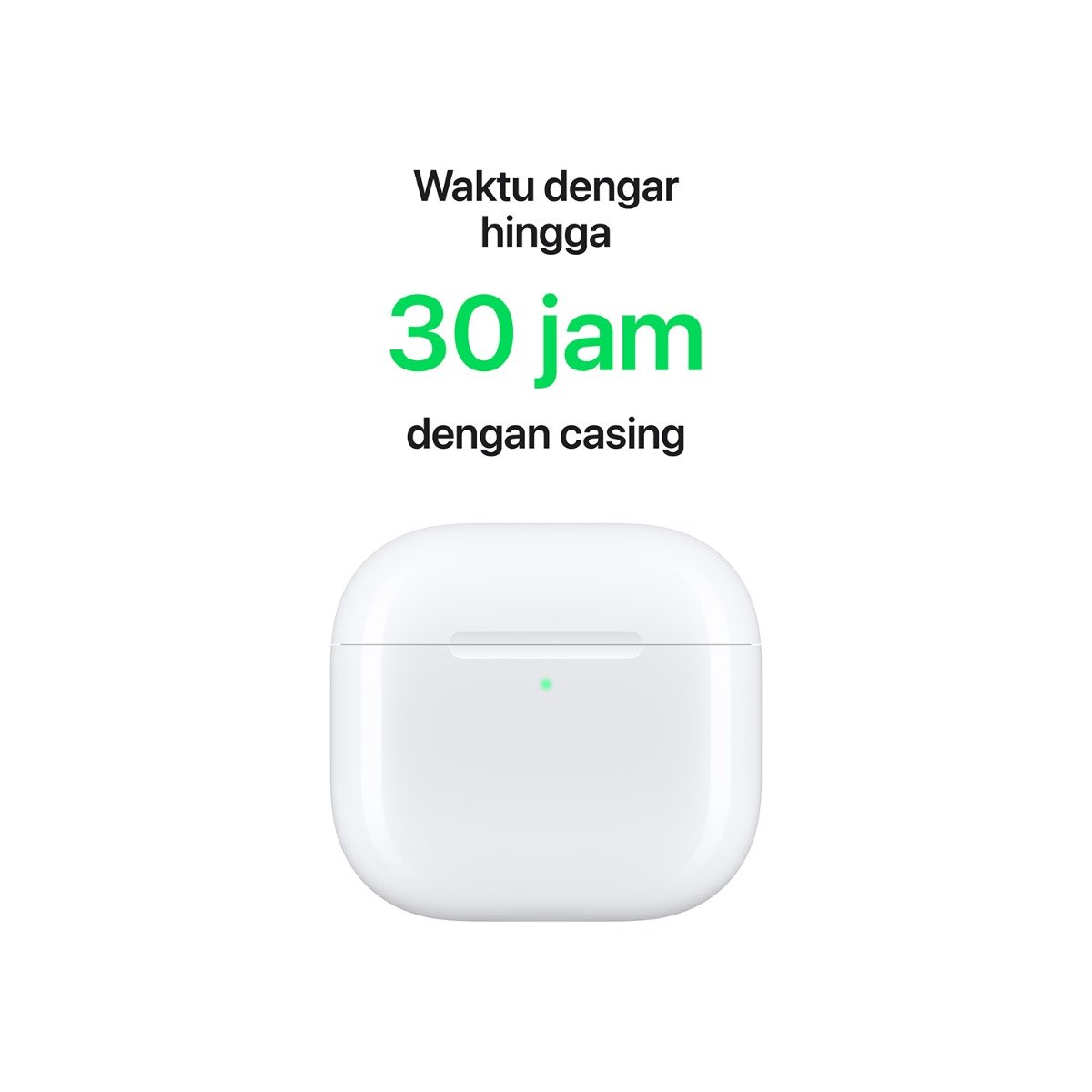 Kesadaran Percakapan, dan Kontrol Kebisingan nonaktif. Dengan Kontrol Kebisingan diatur ke Peredam Kebisingan Aktif, waktu dengar hingga 4 jam. Pengujian dilakukan dengan menguras baterai AirPods yang penuh sambil memutar audio hingga salah satu AirPods berhenti melakukan pemutaran. Kekuatan baterai bergantung pada pengaturan perangkat, lingkungan, penggunaan, dan banyak faktor lain.