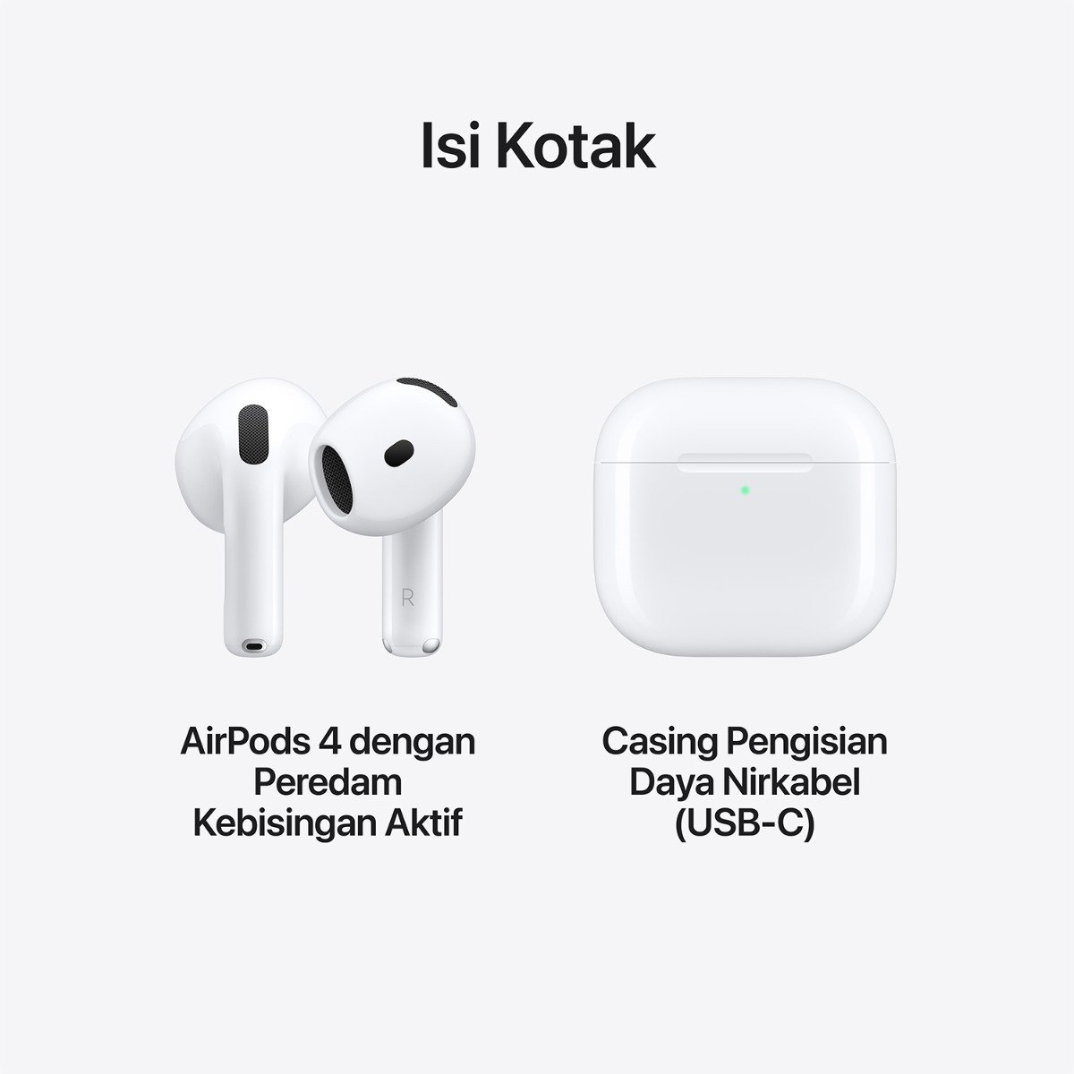 AirPods 4 dengan Peredam Kebisingan Aktif—menghadirkan pengalaman audio yang sepenuhnya baru dengan Audio Adaptif dan mode Transparansi,(1) serta ukuran yang lebih tepat untuk kenyamanan sepanjang hari.
